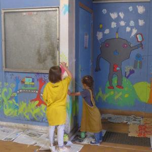 Enfin, à la Maison pour Tous de Susville, une fresque murale a été réalisée par les enfants, invités à imaginer des architectures inédites, et à les représenter en utilisant toute sorte d’objets à détourer.